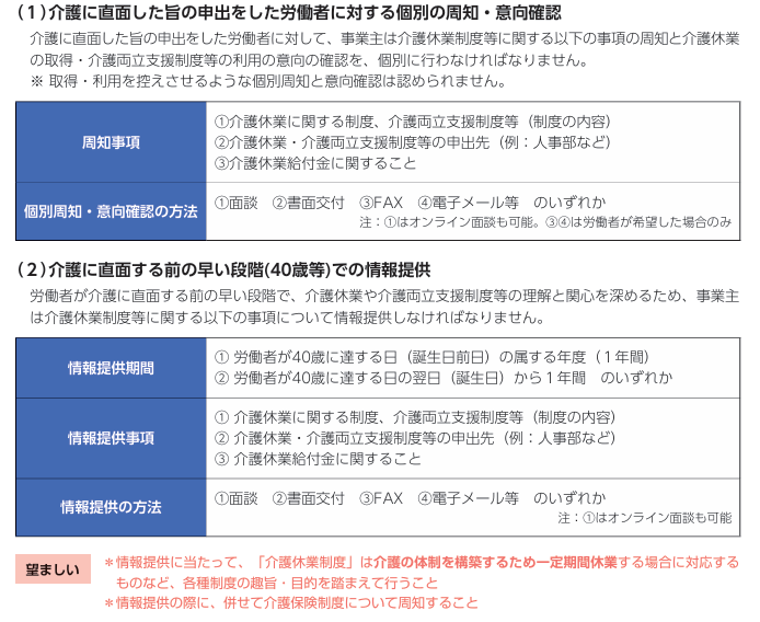 そして、介護離職防止のための個別の周知・移行等確認等においては申出をした人と、従業員さんが40歳になった時の2種類があり・・・次のようになっています。