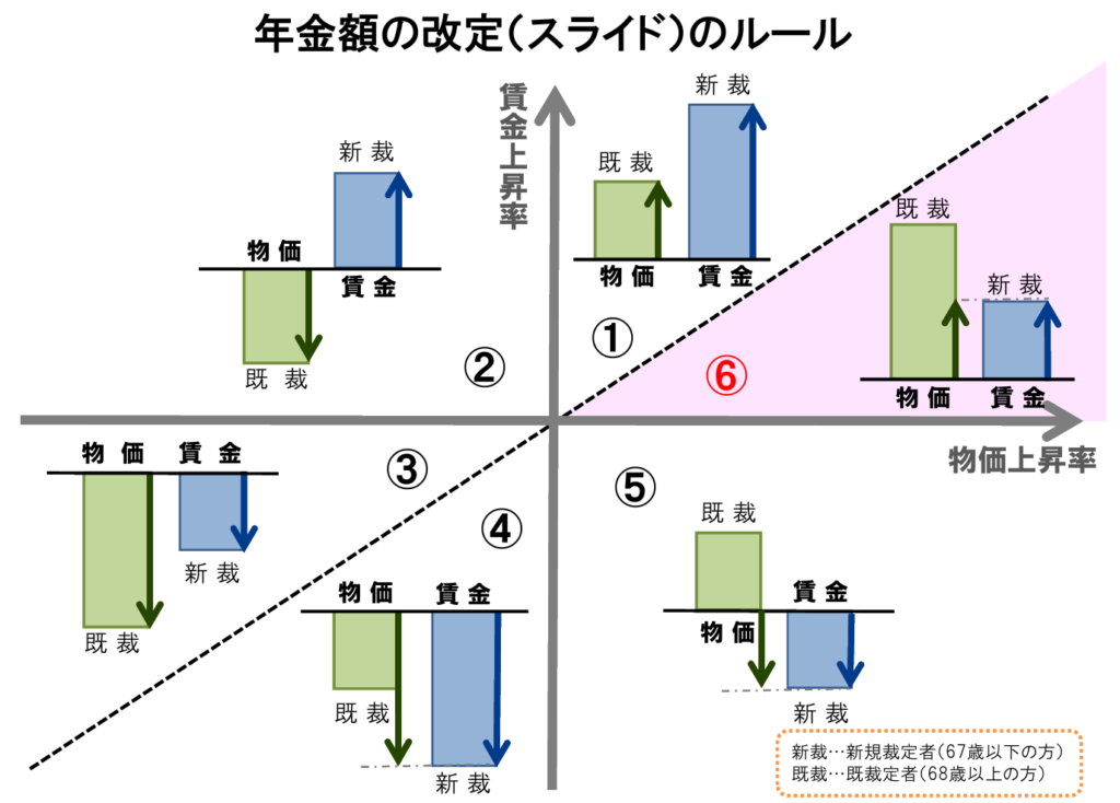 上の図の様に基本的には既裁定者は物価上昇率、新規裁定者は賃金上昇率を基に年金額が改定されるのですが、ちょっとだけ例外(というか、一方的に既裁定者が不利な特例)があって、物価上昇が賃金上昇より高い場合は、既裁定者も賃金上昇に合わせるというルールがあります。同様に賃金上昇率がマイナスで物価上昇率がプラスもしくは賃金上昇率よりもマイナス幅が少ない場合も、賃金上昇率に合わせて改定されます。要するに、既裁定者が新規裁定者より高い上昇率になりそうなときは新規裁定者に合わせるという事になっちゃいます。まぁ、何とも納得しがたいですが、そのようなルールとなっています。でもって、今回は上の図で言うピンクの所である⑥の状態(物価上昇率、賃金上昇率共にプラスだけど、物価上昇率が高い)となっており、既裁定者も新規裁定者と同様の上昇率となります。